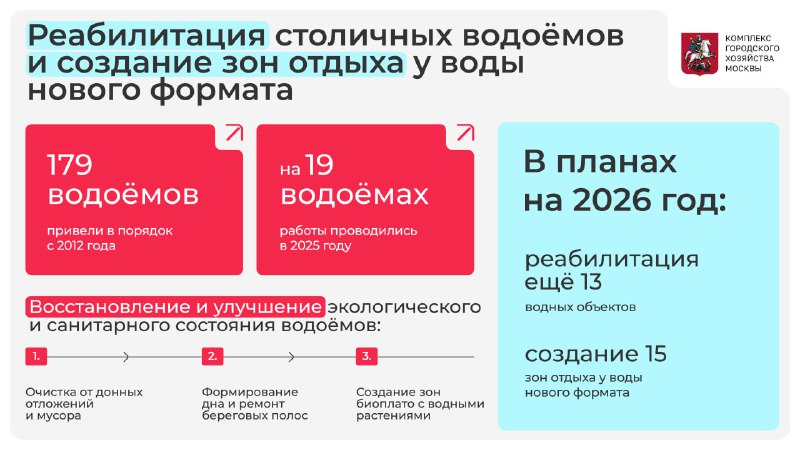 В планах на 2026-й — реабилитация 13 водных объектов, включая Большой Молжаниновский, Егерский, Мичуринский, Тереховский пруды.