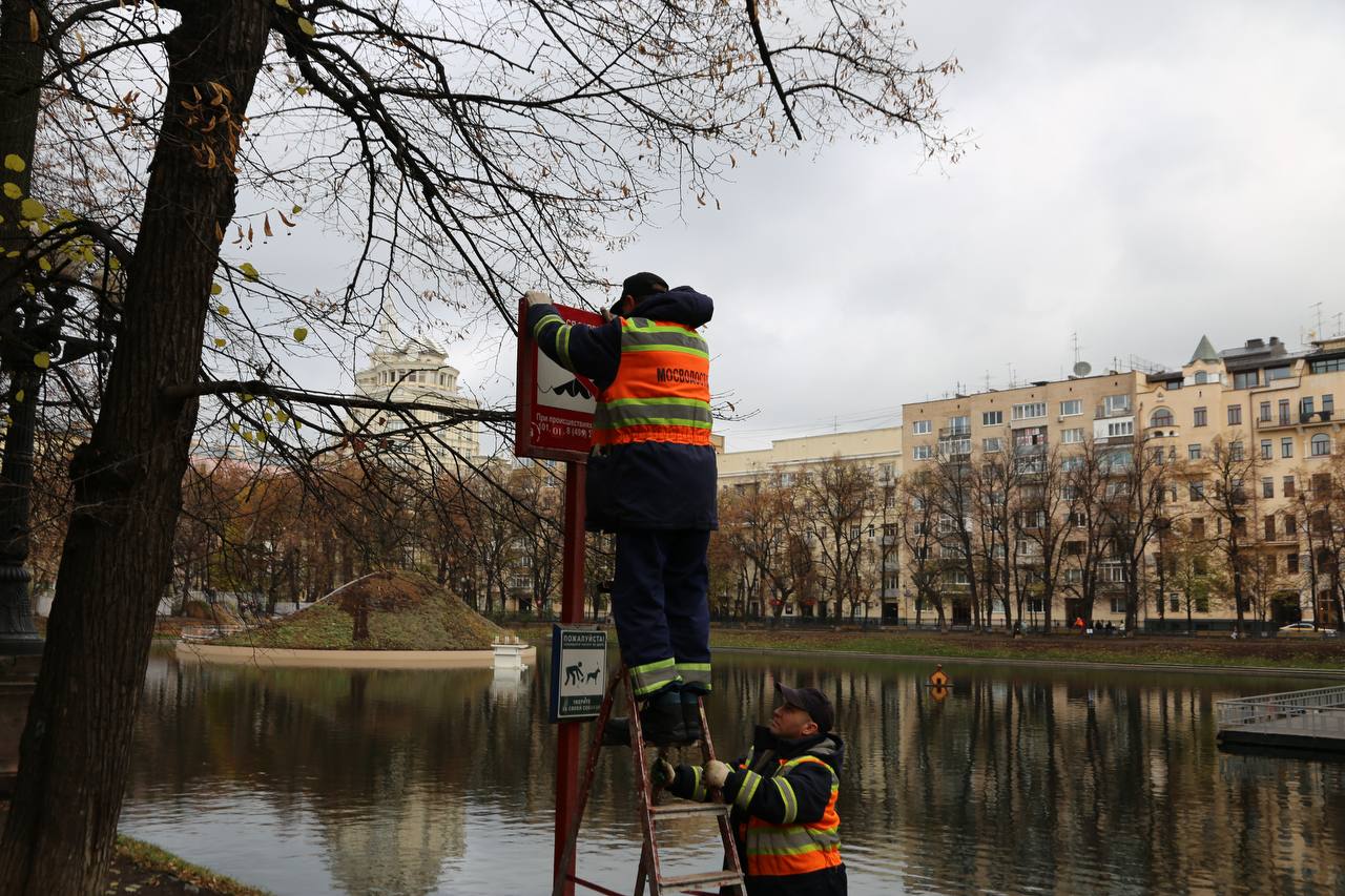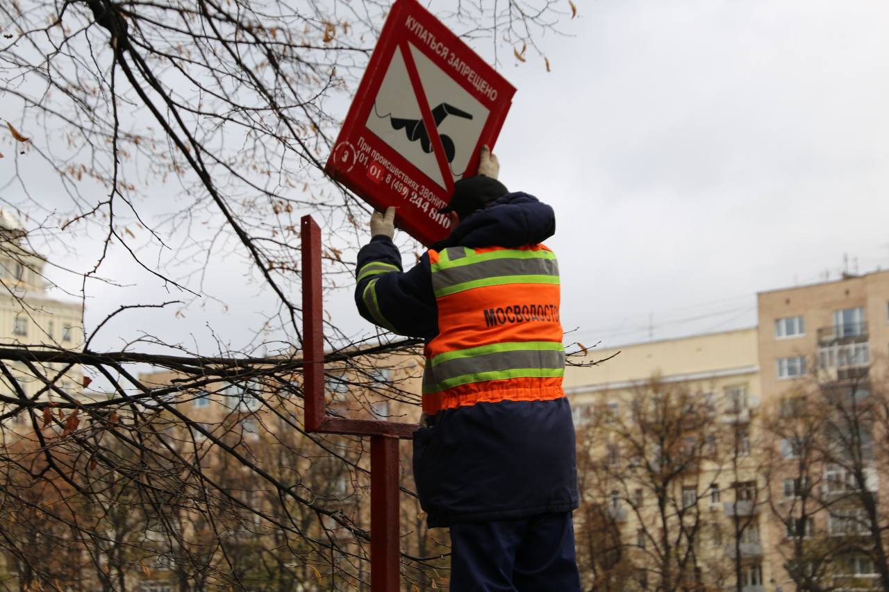 Незадолго до образования льда на прудах специалисты заменяют летние информационные щиты «Купаться запрещено!» на зимние «Выход на лед запрещен!».