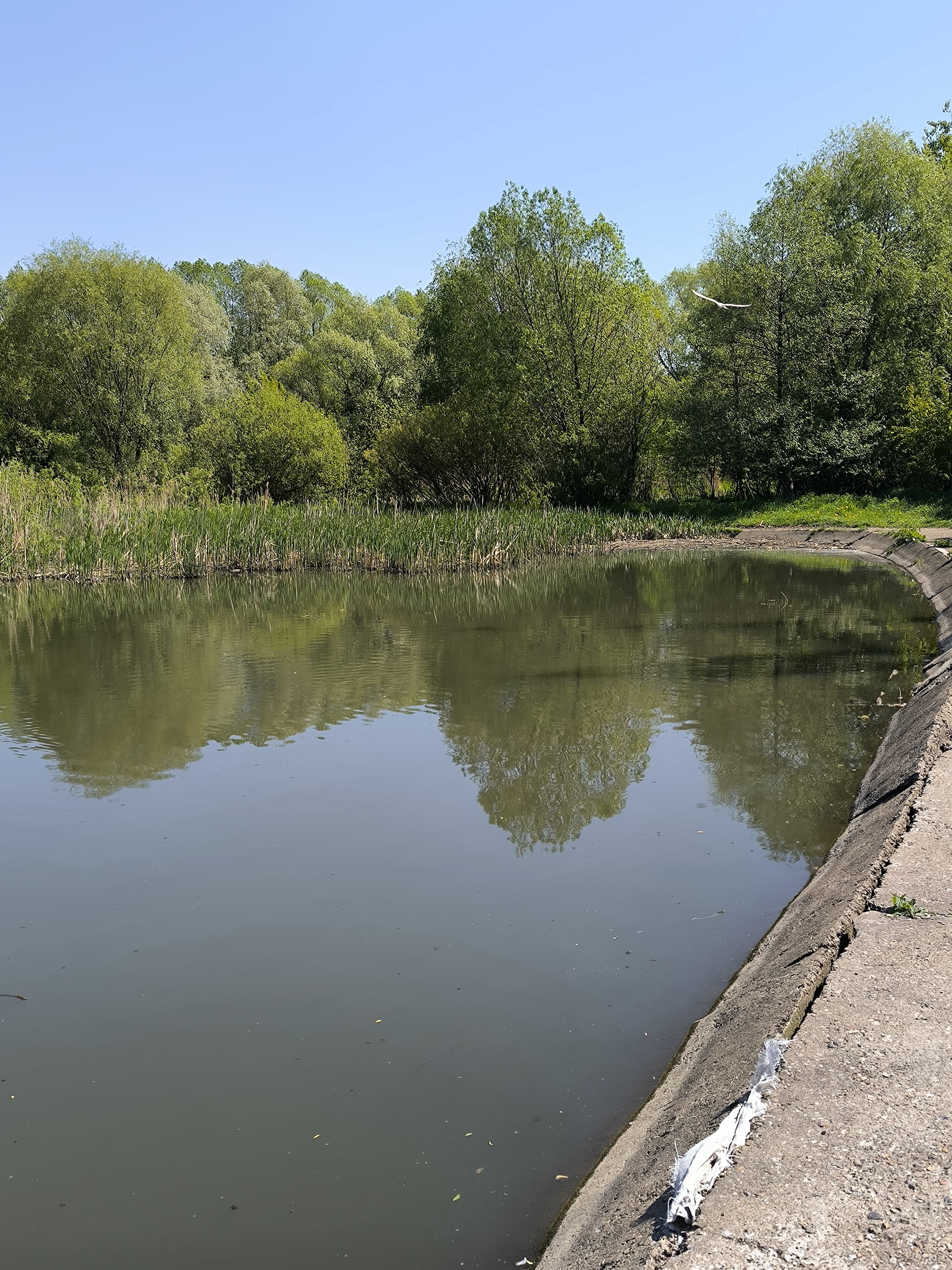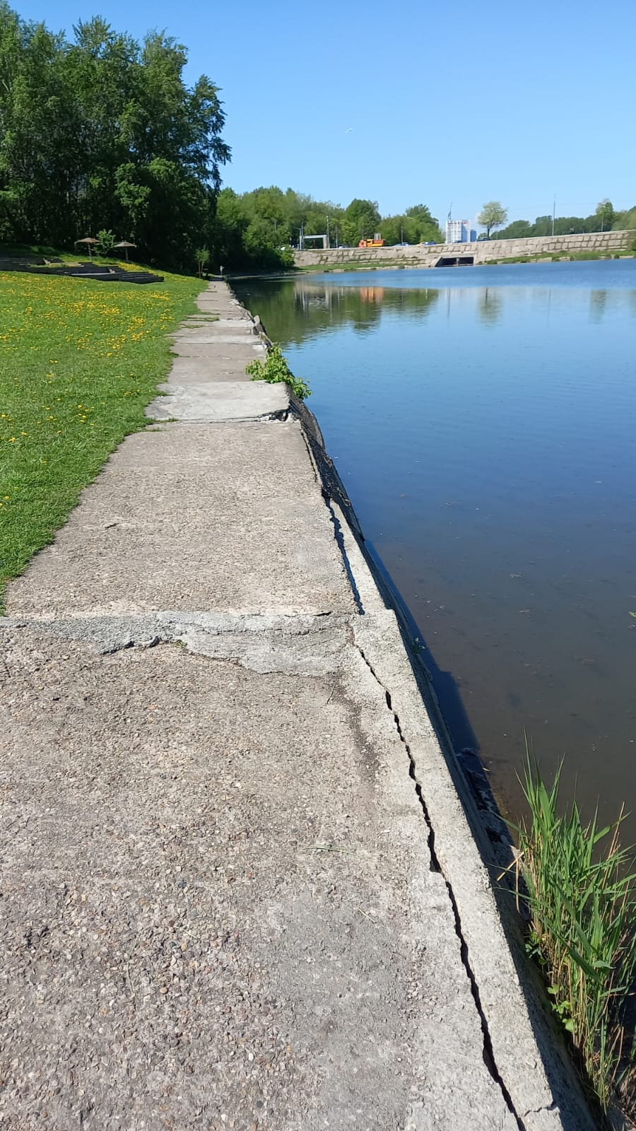- Устройство береговой полосы — пологие откосы из камня втопленного в бетон и песка, вертикальная подпорная стенка;